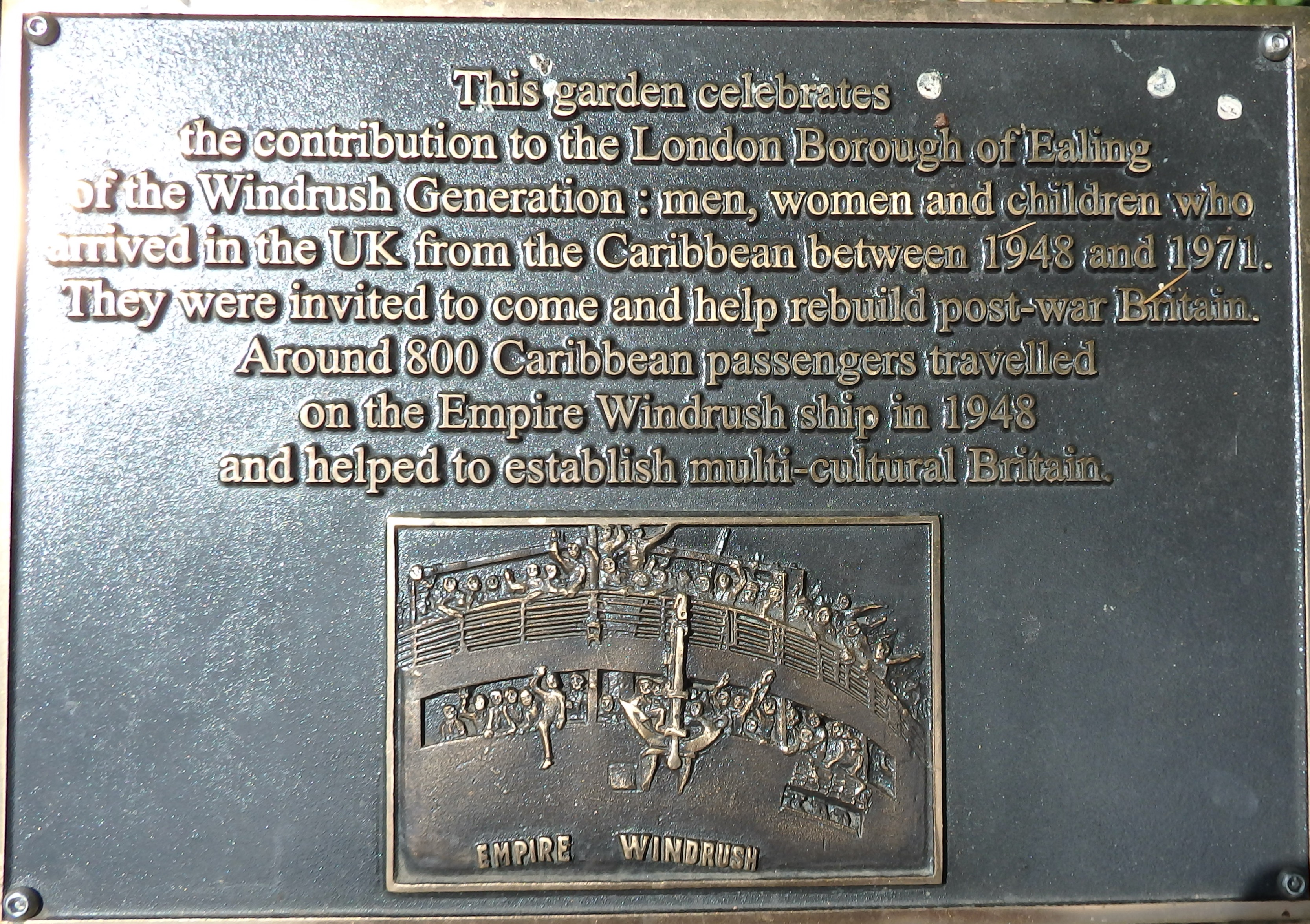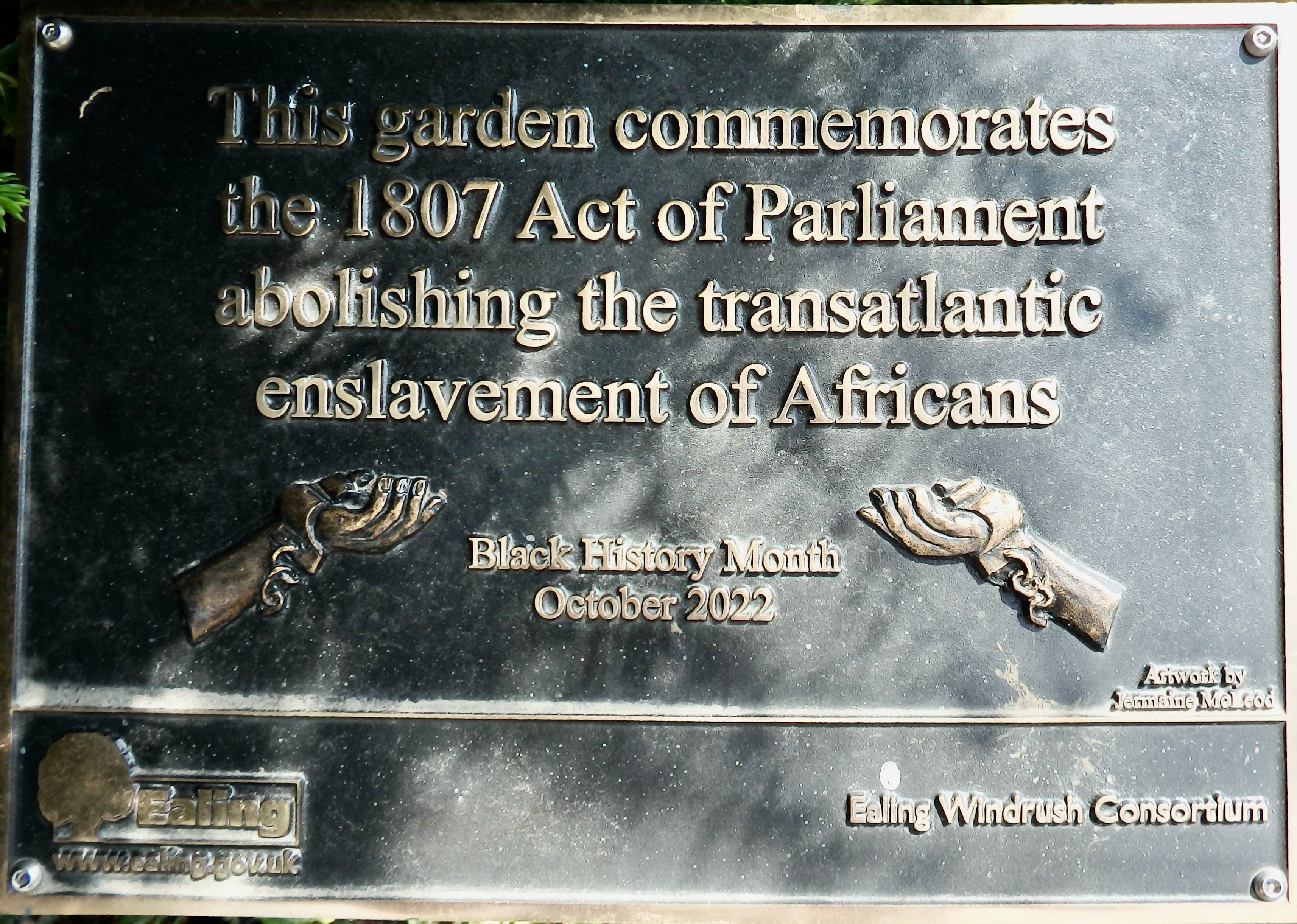 Also in Walpole Park is this memorial to Charles Jones, variously borough surveyer and later architect to Ealing. It is located next to the north wall of the park just behind the Manor building, where a small memorial garden has been created. More recently, two memorial plaques (seen below) have been erected in the garden, one commemortating members of the Windrush generation who made their homes in the borough, and one commemorating the 1807 Act of Parliament abolishing slavery.