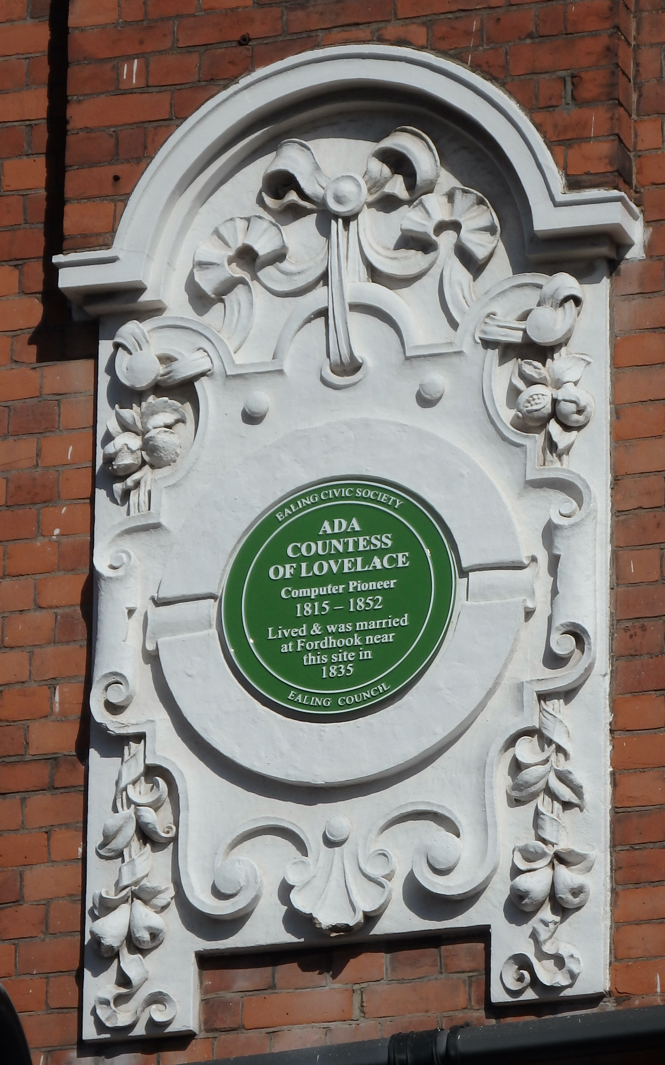 Ada’s connection with Ealing is that she lived with her mother at Fordhook House, (seen below in about 1810); the house is long gone, but the name lives on as “Fordhook Avenue”, and another street in the area is called Byron Road. The plaque (below right) is mounted on the building on the corner of Fordhook Avenue where it meets the Uxbridge Road.